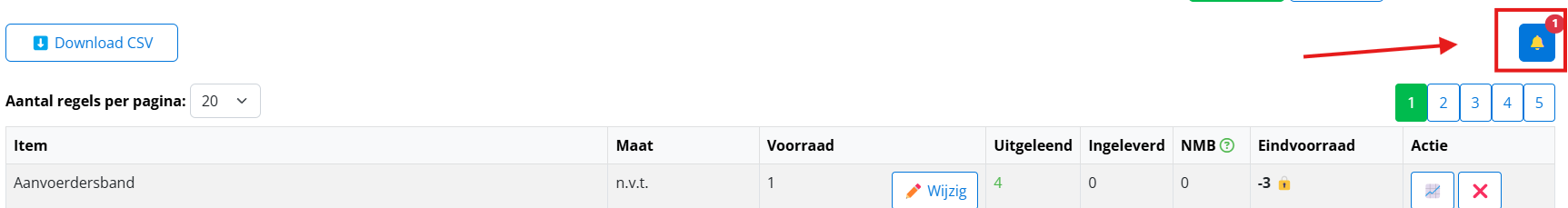 Bij het notificatiebelletje krijg je een getal te zien als er een item onder de minimale voorraad komt (zie afbeelding), klik je op dit belletje dan opent er een pop-up. Hierin krijg je een overzicht welke items onder de minimale voorraad zijn gekomen.